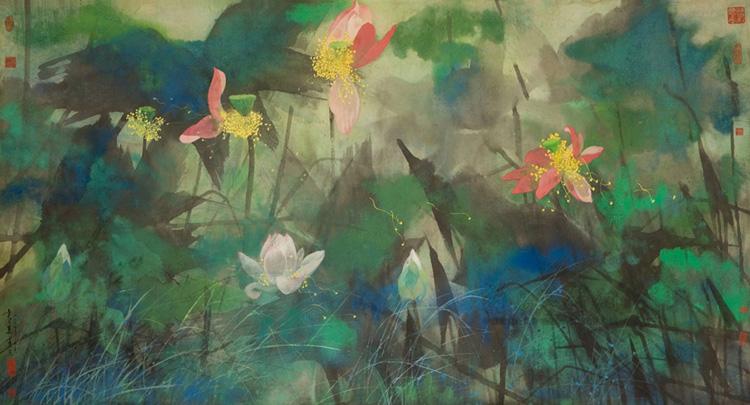 為了展現(xiàn)中華名族的蘇繡文化,蘇繡的作品開始進入國家政治場所,在人民大會堂有蘇繡的作品,蘇繡也不僅一次的作為外交禮品贈與國外元首。隨著香港回歸祖國,外交部駐港機構也需要裝飾布置。為了體現(xiàn)我國的優(yōu)秀傳統(tǒng)文化,有關部門決定采用四大名繡之一的蘇繡作為該機構貴賓室內(nèi)的陳設品。選用的畫稿是由中央工藝美術學院教授袁運甫設計的《彩墨荷塘》,這幅畫采用虛實亂針繡和平針中各種針法相結合的多種針法,既見粗獷筆墨,又有細致刻畫,精心繡制成雙面異色亂針繡《彩墨荷塘》,高1.1米。寬2.3米。原作以大膽老辣的中國傳統(tǒng)潑墨和西洋絢麗濃艷的色彩,描繪了一副生機黯然的荷塘景色,繡工使用了五百多種色線,真實地反映了原作的精髓,既強調(diào)了光色效果,又很好地處理了虛實搭配。繡面上粉紅色、白色的荷花亭亭玉立,金黃色花蕊中幾支嫩綠色的蓮蓬清香遠溢,碧綠的田田荷葉在深藍底色的烘托下色彩交相滲透,枝干、細草、慈姑葉有的掩映在荷葉中,有的錯落有致地呈現(xiàn)在荷葉叢間,富有生氣地展示了仲夏荷塘的清麗之美。這還是至今最大的雙面繡亂針作品。