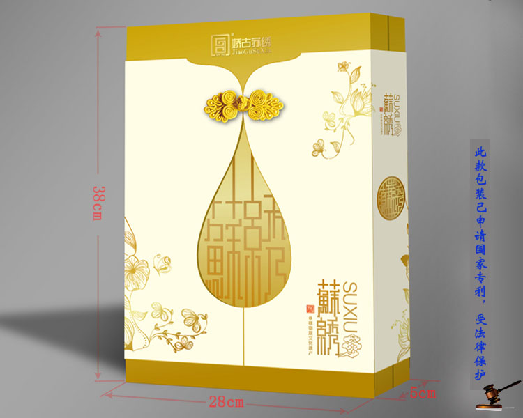今年嬌古蘇繡又在行業(yè)內(nèi)將產(chǎn)品包裝進(jìn)行了更新?lián)Q代,精美的蘇繡工藝品應(yīng)該配有設(shè)計(jì)的包裝,這樣才能彰顯其獨(dú)特藝術(shù)價(jià)值,由專業(yè)的設(shè)計(jì)公司為嬌古蘇繡設(shè)計(jì)了這款包裝,產(chǎn)品一經(jīng)使用,客戶的認(rèn)可度高,為此嬌古蘇繡還特為此款原創(chuàng)設(shè)計(jì),受到法律的保護(hù)。 |