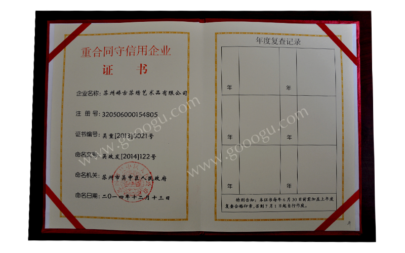 2014年底正是收獲的季節(jié),嬌古蘇繡榮獲蘇州市吳中區(qū)人民政府授予的重合同守信用單位榮譽(yù)稱號(hào),蘇州嬌古蘇繡藝術(shù)品有限公司是一家專(zhuān)業(yè)的蘇繡制作企業(yè),公司集設(shè)計(jì)、制作、銷(xiāo)售于一體,多年來(lái)公司秉承信用至上 質(zhì)量第一的創(chuàng)業(yè)理念得到地方政府和企業(yè)的高度贊賞和認(rèn)可。 .jpg)