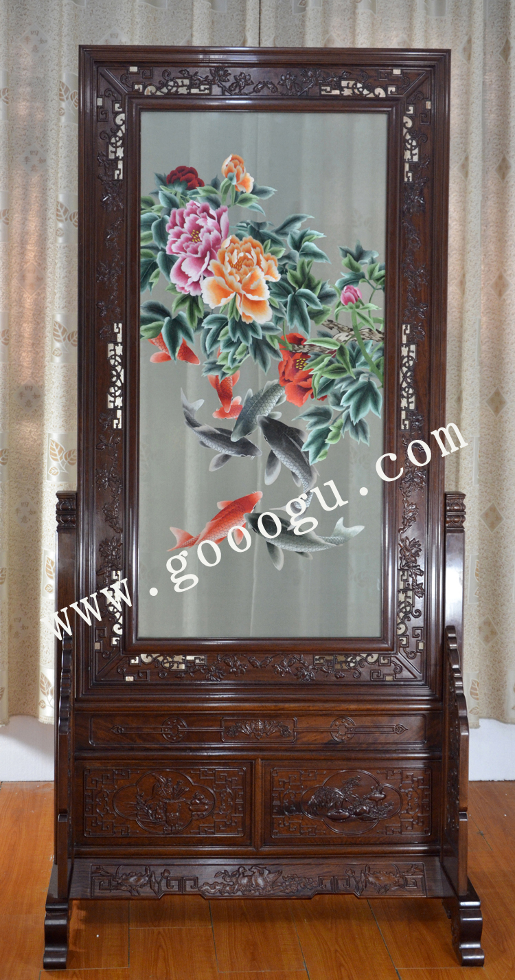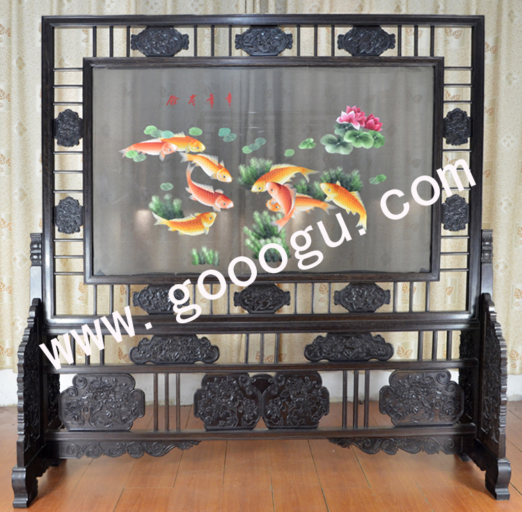 蘇繡屏風 簡易框架 雙面繡 年年有余 雞翅木 家用隔斷