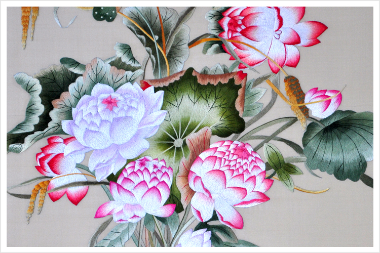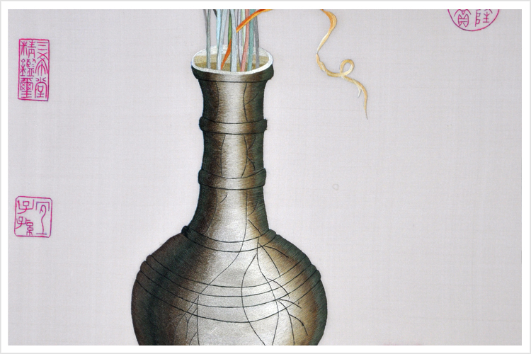 【品 牌】:嬌古品牌蘇繡 【品 名】:聚瑞圖裝飾畫(純手工蘇繡) 【品 質】:1-2絲刺繡 (蘇繡小知識:1根蘇繡絲線可分為16絲,中檔刺繡皆為10絲所繡,中高檔刺繡皆為6-8絲,高檔刺繡皆為4-6絲,精品刺繡皆為1-4絲) 【尺 寸】:畫心尺寸38*70cm 整體尺寸60*110cm 【產品工藝】:手工刺繡+真絲底料 【絲線材質】:蠶絲線 。 【用 途】:政府禮品、個人收藏、外賓禮品、生日禮物、賀壽禮品、領導升遷、出國禮品等等。 【出廠價格】:7300元 【作品介紹】:郎世寧為清早期著名的宮廷畫家,西名加斯提里阿納Giuseppe,意大利美朗諾市人。于康熙五十四年(1715)來華傳教,時年27歲,召入內廷為畫院供奉,歷仕三朝。畫法參酌中西,善寫生,人物、花鳥,奕奕有神,尤工畫馬,如百駿圖、名馬圖、武功圖至今有聲世界。郎氏初本欲將西法輸入中國,因不為清帝所喜,遂創(chuàng)折衷畫法。一時從之學者甚眾,流風至今未絕。卒年七十八?!豆蕦m郎世寧畫集》。郎世寧的主要活動在乾隆時,除了畫弘歷的肖像外,為清宮畫了不少戰(zhàn)功圖,也畫馬、畫花卉。 這幅畫於雍正元年(1723年),是現存郎世寧最早的記年作品。表面上有如西洋的靜物寫生,其內容卻顯示著中國宮廷對於祥瑞的慶賀態(tài)度。花卉、瓷瓶上都有光源反光的描繪,但是減緩了對比,顯示出一種溫和的西洋畫風。 【細節(jié)欣賞】 .jpg)