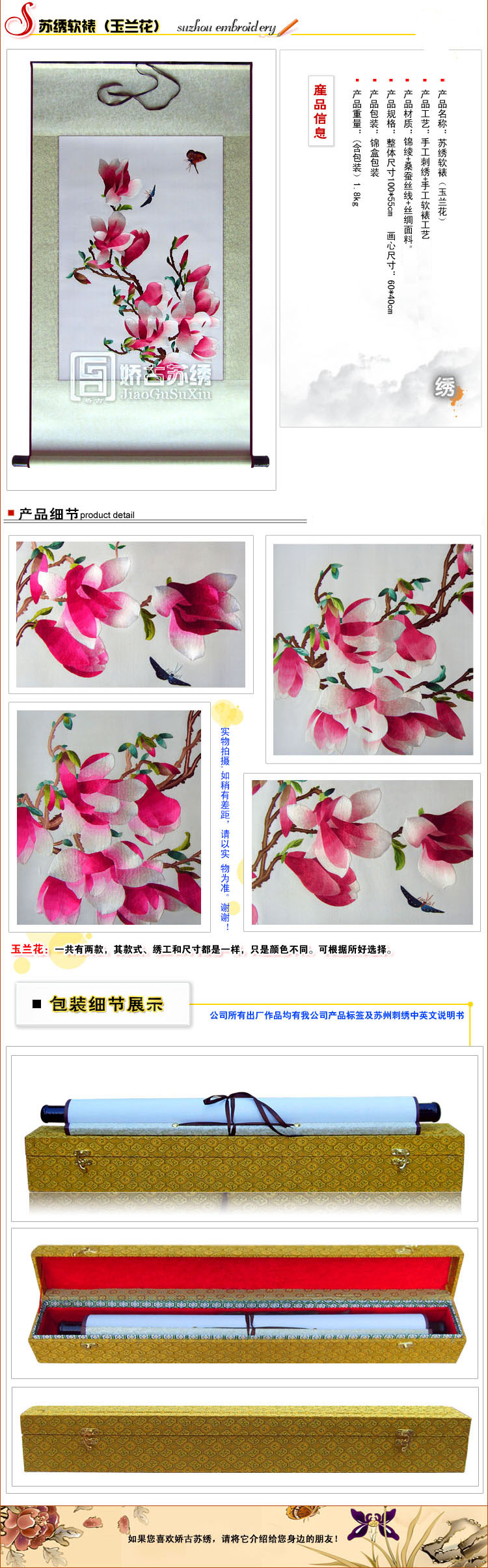 【嬌古蘇繡】蘇繡精品軟裱畫、玉蘭花裝飾畫&喬遷禮品、送女士的禮品