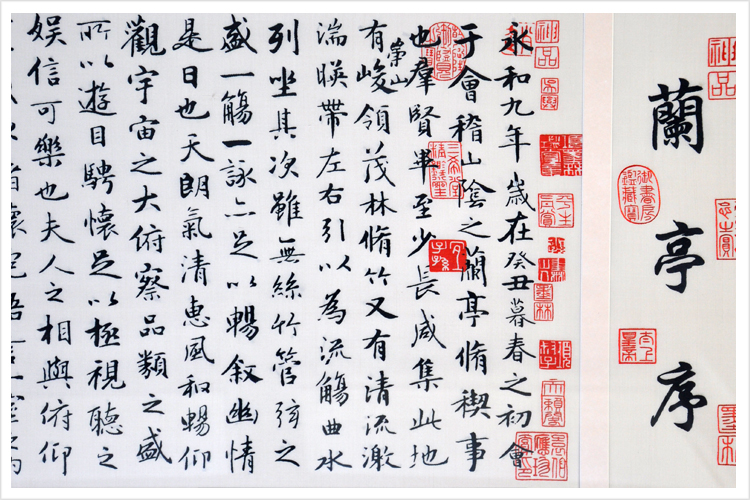 《蘭亭集序》文字燦爛,字字珠璣,是一篇膾炙人口的優(yōu)美散文,它打破成規(guī),自辟?gòu)锦?,不落窠臼,雋妙雅逸,不論繪景抒情,還是評(píng)史述志,都令人耳目一新。雖然前后心態(tài)矛盾,但總體看,還是積極向上的,特別是在當(dāng)時(shí)談玄成風(fēng)的東晉時(shí)代氣氛中,提出一死生為虛誕,齊彭殤為妄作,尤為可貴?!短m亭集序[1]》的更大成就在于它的書(shū)法藝術(shù)。通篇?dú)庀⒌涂侦`、瀟灑自然;用筆遒媚飄逸;手法既平和又奇崛,大小參差 ,既有精心安排藝術(shù)匠心,又沒(méi)有做作雕琢的痕跡,自然天成。其中,凡是相同的字, 寫(xiě)法各不相同,各有變化,特別是字,達(dá)到了藝術(shù)上多樣與統(tǒng)一的效果?!短m亭集序》是王羲之書(shū)法藝術(shù)的代表作,是中國(guó)書(shū)法藝術(shù) 史上的一座高峰,它滋養(yǎng)了一代又一代書(shū)法家。