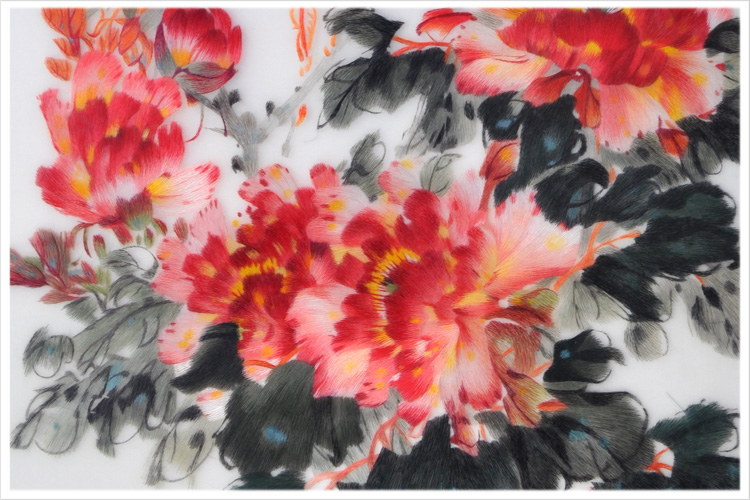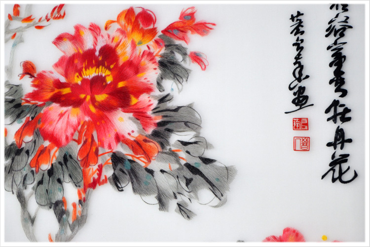 【品 牌】:嬌古 (作品代碼 D-1025) 【品 名】:國(guó)花牡丹裝飾畫(huà)(手工蘇繡) 【品 質(zhì)】:2-4絲刺繡 (蘇繡小知識(shí):1根蘇繡絲線(xiàn)可分為16絲,中檔刺繡皆為10絲所繡,中高檔刺繡皆為6-8絲,高檔刺繡皆為4-6絲,精品刺繡皆為1-4絲) 【尺 寸】:畫(huà)心尺寸55*100cm 整體尺寸75*135cm 【產(chǎn)品工藝】:手工刺繡 【絲線(xiàn)材質(zhì)】:蠶絲線(xiàn) 【用 途】:居家裝飾或送政府禮品、外賓禮品、生日禮物、賀壽禮品、領(lǐng)導(dǎo)升遷、出國(guó)禮品等等。 【出廠(chǎng)價(jià)格】:16000元 【細(xì)節(jié)圖】