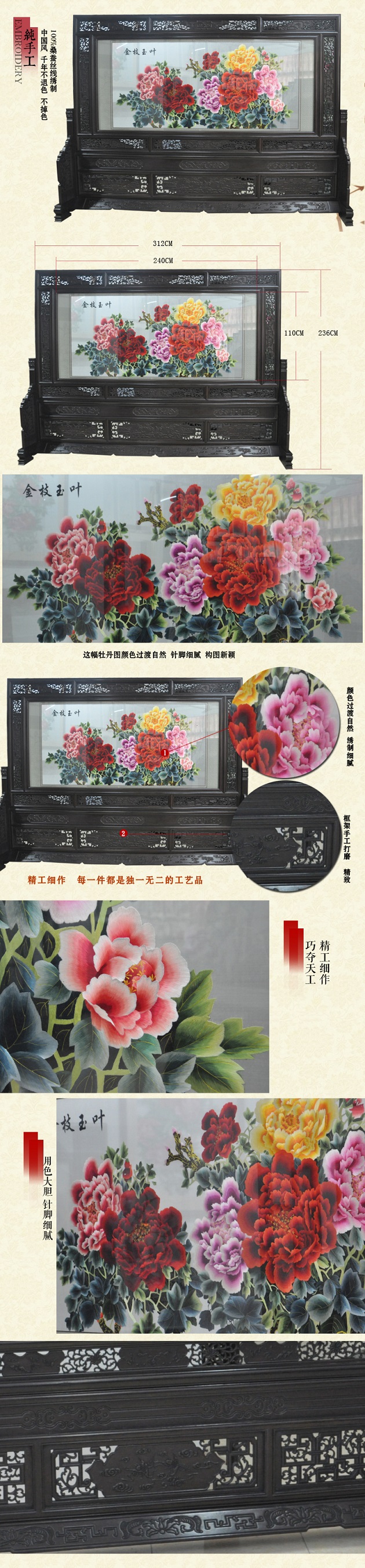 【產(chǎn)品名稱】:金枝玉葉(雙面繡) (作品代碼:p-1527) 【產(chǎn)品規(guī)格】:圖案尺寸寬度240cm,高度110cm 外框整體尺寸寬312cm,高236cm 【產(chǎn)品工藝】:手工刺繡 【產(chǎn)品材質(zhì)】:真絲面料+雞翅木+桑蠶絲線+玻璃 【產(chǎn)品包裝】:木箱包裝,用海綿包扎,確保運(yùn)輸安全 【出廠價(jià)】:58800元 【產(chǎn)品運(yùn)輸】:我司負(fù)責(zé)發(fā)往客戶指定地點(diǎn),蘇州附近城市可送貨上門! 【產(chǎn)品說明】:金枝玉葉雙面繡屏風(fēng),是由蘇州工藝師耗時(shí)數(shù)個(gè)月精心手工刺繡而成,刺繡圖案以國花牡丹為題材繡工精細(xì),簡(jiǎn)約大方,顏色搭配均勻過渡自然,屏風(fēng)的框架選用進(jìn)口的天然雞翅木為料,是蘇繡屏風(fēng)中的經(jīng)典作品。是居家和辦公的重要裝飾品之一!歡迎親臨嬌古蘇繡展示廳觀看實(shí)物! .jpg)